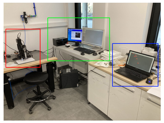 Full experimental setup, outlined with red—micro-manipulator; green—micro-manipulator control; blue—object detection.