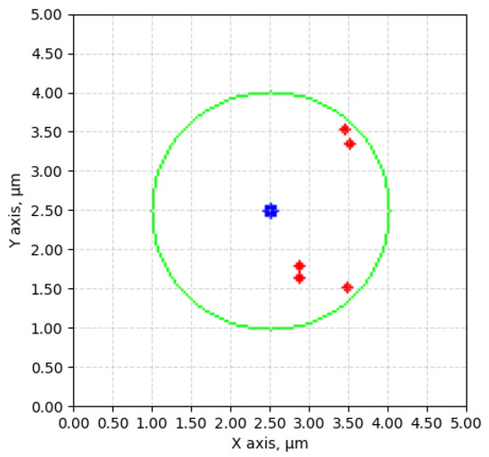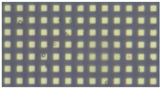 To bridge the gap between camera and robot coordinates, a micro-scale grid with known grid size was used, visible in Figure 9 [48]. With a known mapping from the camera to the robot, the detected object coordinates could be transformed into movements for the robot. In our approach, the center of the camera’s vision was set as the goal for movement. After moving the micro-manipulator, the center of the cell of interest should coincide with the goal. The sample size does not permit a situation where the microscope is placed with the whole sample in the FOV, so a single home pose, from which the whole workspace could be seen, is not viable. For this reason, it was chosen to send relative movement coordinates to the manipulator. Whenever a cell was chosen for inspection, the system would transform the center of the detected cell as an X and Y distance for the micro-manipulator to move, relative to its current position. An example of moving to a detected cell can be seen in Figure 10.