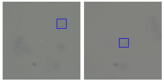 Example of moving the micro-manipulator to a detected cell. Light blue—center of vision; green and dark blue—center and bounding box of chosen cell.