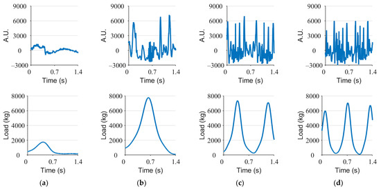 The history of the vibration signal measured from the sensing loop and the mobile load under the wheels. (a) speed = 2 m/s, load level 1; (b) speed = 2 m/s, load level 5; (c) speed = 4 m/s, load level 5; (d) speed = 6 m/s, load level 5.