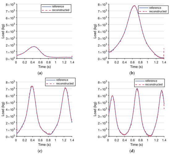 Site 1 reconstruction results. (a) speed = 2 m/s, load level 1; (b) speed = 2 m/s, load level 5; (c) speed = 4 m/s, load level 5; (d) speed = 6 m/s, load level 5.