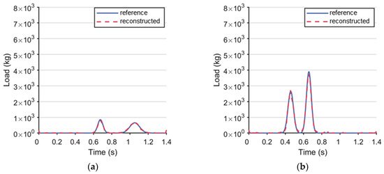 The TCN load–time-history reconstruction network was constructed according to the structure presented in Figure 3, and the training strategy is as illustrated above. For Site 1, the length of the input sequences was 5 × 700, which corresponds to a signal duration of 1.4 s, using half of the sensing loop data. The TCN network reconstructed the time histories of 1338 test samples, whose speed and load were unknown in advance, using a batch size of 32. For Site 2, the length of the input sequences was 8 × 700, corresponding to one row of the sensing loop data. The TCN network reconstructed the time histories of 201 test samples whose vehicle locations were unknown in advance, using a batch size of 16.