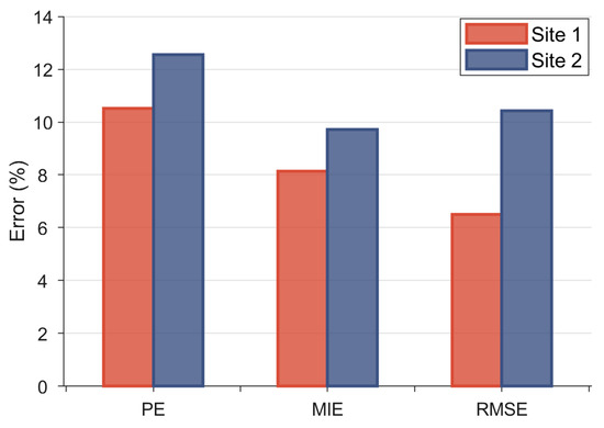 To quantitatively evaluate the performance of TCN, the peak error (PE), main impulse error (MIE), and root mean square error (RMSE) are calculated and compared in Figure 9. The results indicate that the proposed method achieves good performance for both Site 1 and Site 2. According to Equation (1), for both Site 1 and Site 2, all samples result in 11.5% PE, which is close to the errors allowed by the Long-Term Pavement Performance Program (LTPP) of 10% [1]. Compared to Site 1, the peak error is slightly increased and the RMSE is well behaved for Site 2. Since Site 2 is a practical scenario, it can be concluded that the proposed TCN model has good time-history reconstruction accuracy for axle loads under conditions of complex traffic.