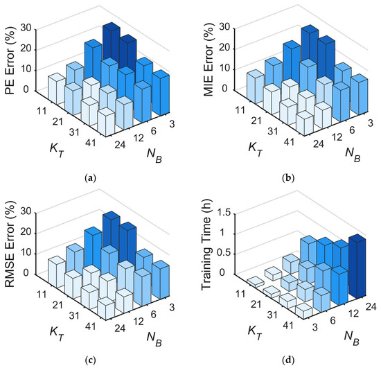 The peak and the axle impulse represent high-frequency and low-frequency features, respectively. Figure 10 illustrates that when utilizing a large value for NB, the influence of KT on recognition performance is diminished. Specifically, the value of KT-21 results in a smaller PE compared to the values of KT-31 and KT-41 under NB-12 while the opposite trend is observed for MIE. NB, on the other hand, plays a vital role in reconstructing the impact load–time history, as the network’s fitting ability increases with its depth. However, deeper layers require longer training times. Hence, we select the network with KT = 31 and NB = 12 as the optimal architecture, taking both factors into account. Finally, the mean estimation error, computed by averaging the values of PE, MIE, and RMSE, is found to be 10.89%.