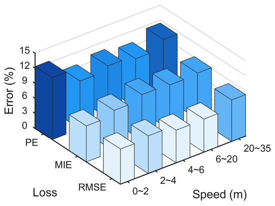 Figure 12 shows the performance of the TCN model at different speeds. Intervals are established based on the speed distribution, with five intervals in total. There is a correlation between PE and speed, with PE being higher for speeds No. 1 and 5 compared to the other speeds. This is because faster speeds result in higher dynamic load factors, whereas slow speeds lead to weaker road vibration responses. When the signal-to-noise ratio is low in these cases, the vibration signal’s peak feature may be overwhelmed by noise and, thus, become more difficult to detect. The PE of the proposed method remains small even in cases with low SNR, while there is not much change in MIE and RMSE. This observation reflects that the network captures low-frequency features effectively.