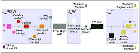 The system plant consists mainly of the vehicle under the test powertrain, which is, in this case, a front-wheel-drive electric vehicle. A constant velocity (CV) shaft connects each loading machine with the powertrain’s corresponding axle and wheel hub. The installed measurement devices are an angular speed sensor at each loading machine end and a moment sensor at each wheel-hub end.