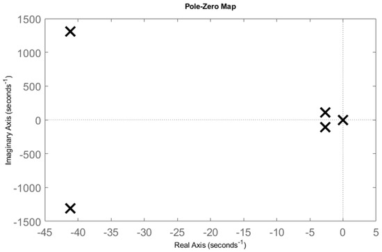 The three-mass system model has five poles 0, −2.65 ± j 108, and −41.2 ± j 1310, as shown in Figure 4. The pole at 0 makes the system marginally stable. The other poles characterize the plant system’s resonance frequencies: 108 rad/s and 1310 rad/s, and the corresponding damping ratios: 0.0244 and 0.0315. The poles 0, −2.65 ± j 108, which demote the original system’s stability, are dominant. Obviously, the system requires a control algorithm that makes it more stable and enhances the damping properties. Suppose a shaft with relative flexibility connects the wheel-hub with the loading machine. In that case, a control algorithm is required to compensate for the mechanical losses and suppress the vibrations in the system [2]. These are achieved mainly by manipulating the angular speeds to minimize the twist angle differences between the shaft ends [10,11,12,14,16]. Other sources of torsional vibrations are the backlash between gears [6,23,33,34] and the moment harmonics from the electrical machines [2,23].