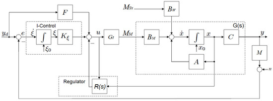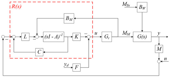 The block diagram representation of the complete system’s transfer function (16) is illustrated in Figure 5. G(s) is the state-space system’s transfer function, and the transfer function from the manipulated variable MM to the output y is given in Equation (17). The regulator transfer function R(s) comprises the state’s feedback controller and observer.
