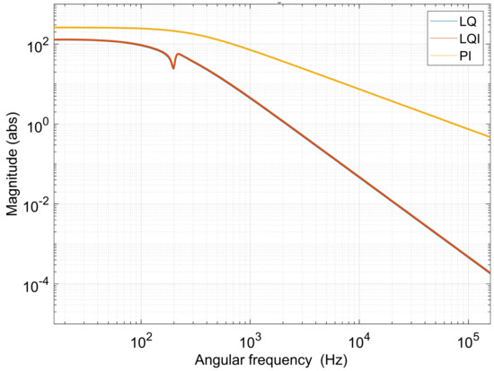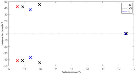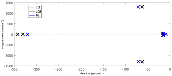 In addition, the low-frequency resonance, attained from complex poles −2.65 ± j 108, is also successfully eliminated by all controllers. Therefore, all the developed controllers can stabilize the closed-loop system since they have successfully eliminated the 0 and −2.65 ± j 108 poles. Figure 8 shows the dominant poles in Figure 7. A subtle difference exists between LQ and LQI poles, although the same Q, R values are employed for both. This difference results from tuning the additional factor in the diagonal matrix Qi. Moreover, LQI has an additional pole on the real axis (i.e., without a complex conjugate part), representing the integral action effect. Therefore, the poles related to the integrator action of both PI and LQI are located approximately at the same location. Therefore, the two underdamped poles of the PI-controlled system are placed as near as possible to other poles of LQ and LQI in order to obtain a comparable dynamic response. However, PI poles cannot be placed arbitrarily in the space (i.e., they could not be placed closer to LQ or LQI poles, no matter how many more tuning iterations are performed). This result confirms the same conclusion in [10,14] that PI controller is more constrained than SS controllers.
