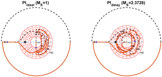 The Nyquist plot in Figure 9 shows that the PI closed-loop control system has high robustness with MSv = 1 in the ideal case (i.e., GΔ = 1), while it shows unsatisfactory robustness of MSv > 2 in the presence of a 0.9 ms delay. The Nyquist contour is very close to the −1 point, explaining the low robustness evaluation. Nonetheless, according to Nyquist stability criteria, the closed-loop with the PI controller is stable.
