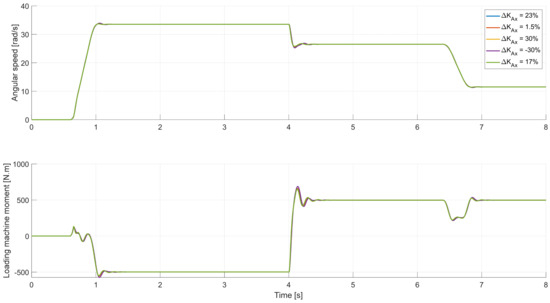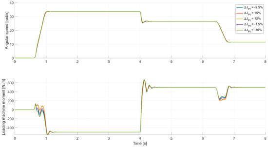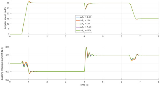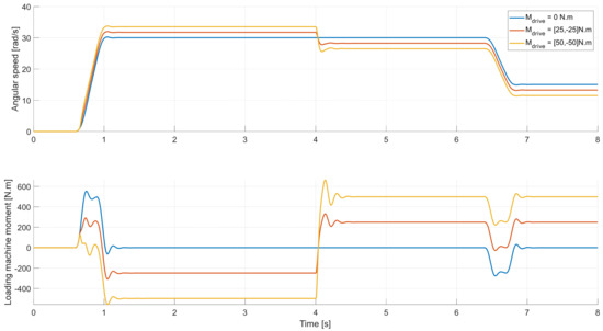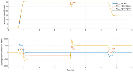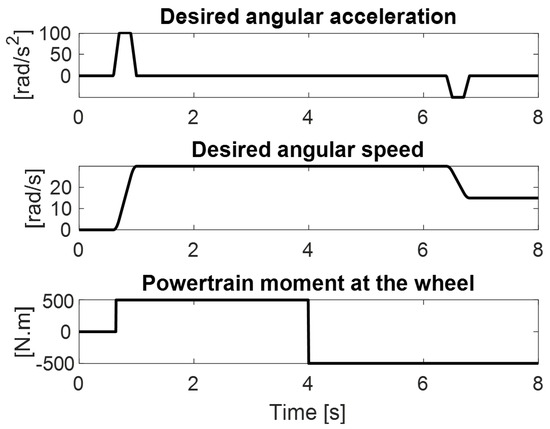 In Figure 13, the middle figure shows the desired angular speed, as attained by integrating the angular acceleration signal [10]. The advantage of using this approach is to smoothen the sharp transition angles in the speed profile. In doing so, the high peaks in the system’s acceleration, which may cause high moment impulses, are avoided. The test is highly dynamic due to the abrupt change in angular acceleration 0–1000 rpm (104.7 rad/s) in 0.4 s, equivalent to an acceleration of 9.3 m/s2 to the A-Class test vehicle. The simulated powertrain moment at the wheel-hub will be inverted from 500 to −500 N.m after 4 s. The controllers perceive the final powertrain moment as a disturbance moment. This maneuver will show how effectively each controller would respond to maintain the desired speed in high acceleration and disturbance moment demands.