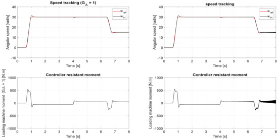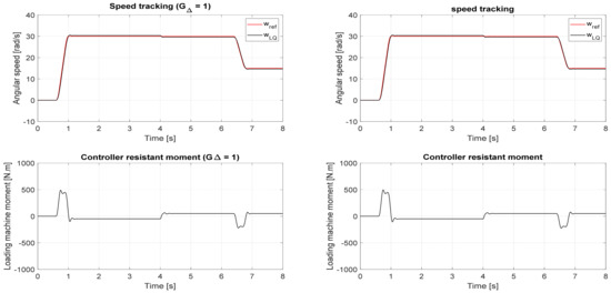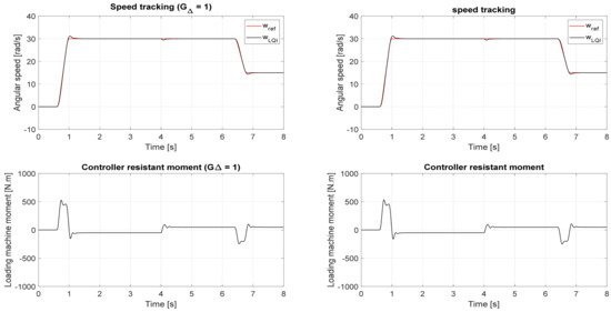 In Figure 14, the figures at the left show the high robustness of the PI-controlled system with the time delay ignored (i.e., in the ideal case, G∆ = 1). The response also showed an excellent tracking performance. Nevertheless, when a 0.9 ms time delay exists, the PI controller begins to perform poorly after the powertrain moment value is inverted, as shown in the figures at the right. This outcome confirms the accuracy of the frequency analysis. The LQ-controlled system displays high robustness even with a time delay, as shown in Figure 15. However, its time response has a steady-state deviation and no significant influence of a 0.9 ms delay on the system.