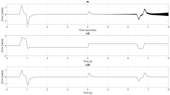 In order to confirm the accuracy of the estimated noise rejection performance, demonstrated in Figure 12, the previous simulation test is executed again. However, this time, white measurement noise is added to the angular speed feedback signal. The previous simulation test is executed again, but this time, white measurement noise is added to the angular speed feedback signal. The white noise has an amplitude of ±0.5 rad/s and a sampling time of 1 × 10−5 s. The noise amplification magnitudes for PI, LQ, and LQI are 4.6778, 0.01878, and 0.01832, respectively. So, the control command is expected to have high noise amplification when the PI controller is implemented. In contrast, LQ and LQI should handle the measurement noise with low influence in the control signal. These expectations are proven in Figure 18, Figure 19 and Figure 20.