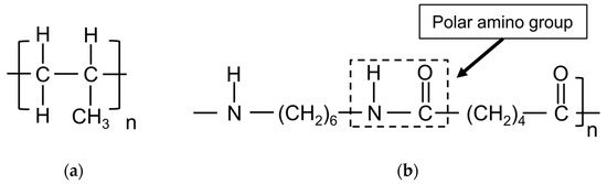 Chemical structure of (a) polypropylene and (b) polyamide 6.6.