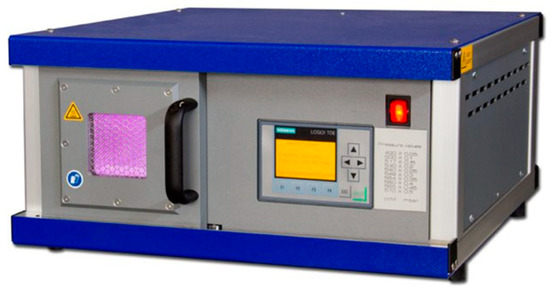 The surface treatment of the plastics was conducted using a SmartPlasma 2 low-pressure plasma system by plasma technology GmbH, Herrenberg−Gültstein, Germany. Argon, water vapor and oxygen served as working gases. The low-pressure plasma was initiated by reducing the chamber pressure to 0.05 mbar using a vacuum pump, followed by inserting the respective working gas to achieve a constant working pressure of 0.1 mbar. This is a continuous process between pumping and gas inlet to ensure a steady working pressure. The generator operates at a low frequency of 20 to 50 kHz at a power level of 80 W. The plastic substrates were exposed to the plasma for 10 s, 180 s and 600 s. Figure 4 illustrates the SmartPlasma2 low-pressure plasma reactor.