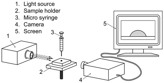 Up to 5 µL water and 3 µL diiodomethane were each deposited on the surface using a micro-syringe. Ten readings for each test liquid were taken at various locations on the treated surface. The ImageJ plugin for contact angles was employed to determine the values of the different readings. The mean wetting angle of diiodomethane was used to calculate the dispersive component of the surface free energy. With the value of the dispersive component and the wetting angle of water, the total surface free energy of the surface could be determined. The measurements were conducted at room temperature with approximately 50% humidity. A schematic of the contact angle measurement setup is illustrated in Figure 5.