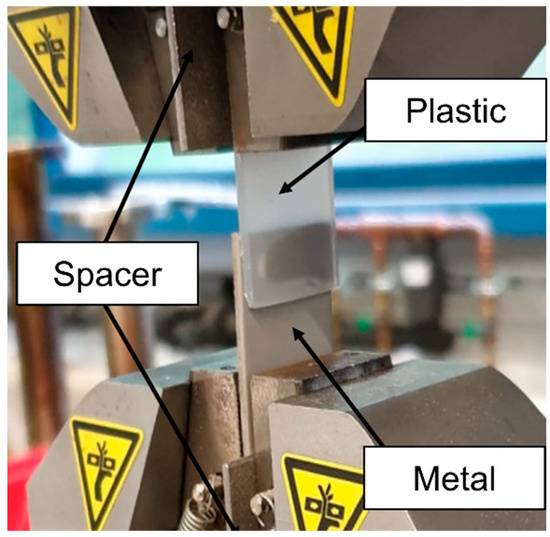 Lap shear tests were carried out using an Instron E10000, Norwood, MA, USA, with a test speed of 0.5 mm min−1 at room temperature and 50% humidity. Spacers were attached at each end of the lap shear samples to ensure a parallel load. The fixation of the samples in the test setup is depicted in Figure 6.