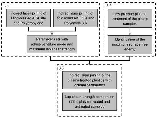 Figure 7 illustrates the structure of the Results and Discussion section in a flowchart, providing an overview of the different content in the subsections. Section 3.1 focuses on the development of the laser joining parameters for sandblasted AISI 304 and polypropylene, as well as cold-rolled AISI 304 and polyamide 6.6. Section 3.2. covers the low-pressure plasma treatment and the identification of the surface free energy. The results of these sections are combined to investigate the influence of increased surface free energy due to the low-pressure plasma treatment on the lap shear strength of the indirect laser-joined hybrids.