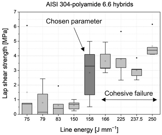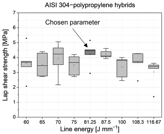 Due to the lower melting point of polypropylene compared to polyamide 6.6, the overall needed line energy to create sound joints is reduced. The lap shear strength of the laser-joined sandblasted AISI 304–polypropylene hybrids is illustrated in Figure 12.