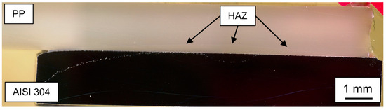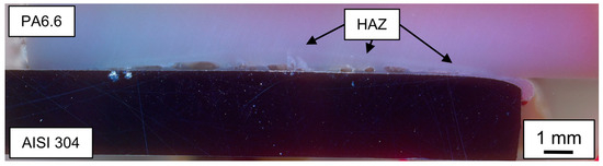 Cross-section of a cold-rolled AISI 304—Polyamide 6.6 (PA6.6) hybrid joined with 158 J mm−1 with visible pores and the heat affected zone (HAZ).