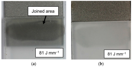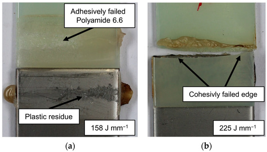 In Figure 10a, an adhesively failed cold-rolled AISI 304–polyamide 6.6 hybrid is shown, and in Figure 10b, a cohesively failed sample at a higher line energy is presented. The hypothesis is that with higher line energy, the thermal damage increases, which leads to a weakened plastic sample. This is also supported by the number of cohesively failed samples. At the line energy of 166 J mm−1, only two of the five tested samples failed cohesively, while at 250 J mm−1, every sample failed within the plastic. Also, the fraction of the plastic residue on the overlap joint increases, which can lead to a higher ratio of cohesive failure.