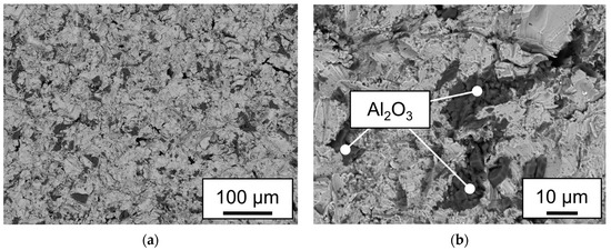 BSE analysis of a sandblasted AISI 304 sample shown in Figure 14 (a) at a magnification of ×200; (b) at a magnification of ×1000 with marked areas of Al2O3 particles.