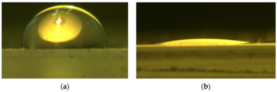 As mentioned in the Introduction section, polar groups in plastic are responsible for chemical bonds in laser-joined metal and plastic hybrids. The low-pressure plasma treatment is a process that introduces these groups on the surface of plastics. Measurements of the wetting angles and the resulting surface free energy provide information about the performance of the plasma treatment. In Figure 16, two water droplets are shown on the surface of polypropylene samples. In Figure 16a, the polypropylene is untreated, while in Figure 16b, the sample was treated in an O2 plasma for 180 s.