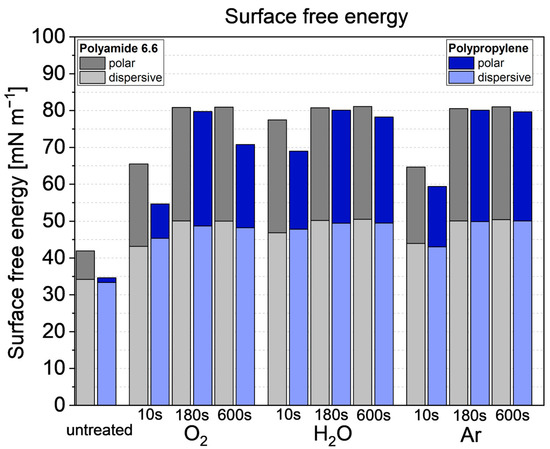 - Low-pressure plasma treatments with argon, oxygen and water as plasma gases increase the surface free energy significantly. The disperse and polar values calculated by the OWRK method were at the same level at 180 s treatment time, elevating the surface free energy by a factor of 2.4 for polypropylene and 2.3 for polyamide 6.6 to ca. 80 mN m−1.