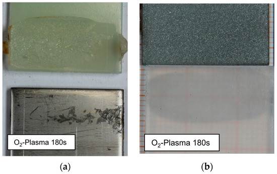 In contrast, the significant reduction in strength of the polypropylene samples is not within the range of the untreated samples in Figure 12. It is possible that the treatment induced the formation of low-molecular-weight oxidized materials, which could melt and form a weak boundary layer at the interface between steel and plastic [34,35]. To analyze the interaction between the plasma treatment and the failure mechanism, Figure 19 provides the macroscopic overview of two lap-shear-tested overlap joints treated with O2 plasma for 180 s.
