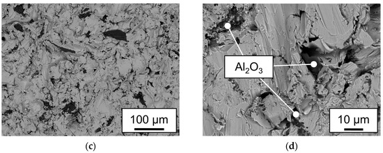 SEM analysis of the steel samples of the O2 plasma-treated hybrids shown in Figure 14; (a,b) show ETD measurements of the cold rolled AISI304−polyamide 6.6 sample; (c,d) show BSE images of the sandblasted AISI304−polypropylene samples.
