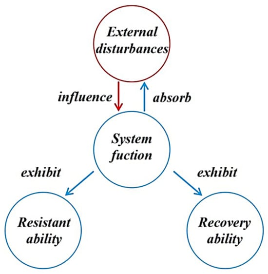 In the conceptual system of resilience, “system” and “external disturbance” are two main elements in the process. Among them, “system” is the main carrier to withstand “external disturbance”. The appearance of “external disturbances” will affect the “system function” and reduce the operating level of the system. “Resistance” and “recovery” are the coping abilities of the system after suffering “external disturbance”. The relationship between the four elements can be described as shown in Figure 1.