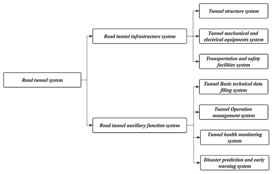 Secondly, the realization of the basic functions of road tunnels not only depends on the existing basic structure and facilities but also on various operating systems, management mechanisms, and resource allocation to ensure the safe operation of road tunnels. So, the road tunnel system can be divided into two systems: the road tunnel infrastructure system and the road tunnel auxiliary function system. The compositions of the two systems are shown in Figure 2.