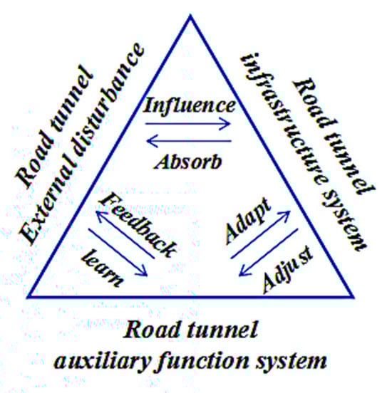 Based on the above analysis of the concept of road tunnel resilience, combined with the concept of the public safety triangle [20], a road tunnel resilience triangle was proposed to specifically describe the relationship between external disturbances, the road tunnel infrastructure system, and the road tunnel auxiliary function system, as shown in Figure 4.