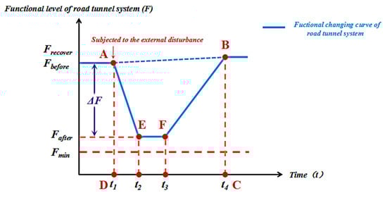In the theoretical analysis model of road tunnels, the road tunnel system operates at a constant functional level before and after being affected by external disturbances. The three stages of road tunnel resilience proposed in Section 3.2 are the AE, EF, and FB segments, as shown in Figure 5. In the AE segment, ΔF is used to describe the degree of damage to the system function or the severity of external disturbances. In the EF segment, the response time of the road tunnel system can be described using t3 − t2. It is used to reflect the soundness of the system’s response mechanism to external disturbances. Under the sound emergency response mechanism, the road tunnel system can quickly start an effective emergency decision-making scheme and prevent secondary damage to the system’s function. In the FB segment, the recovery time of the road tunnel system function is described using t4 − t3. In addition, resilience should be an ability of the system within a certain functional state. If the system function exceeds a certain limit, the system can be considered to enter a “plastic stage” called resilience failure state. Under this state, the road tunnel system should have the following three characteristics: