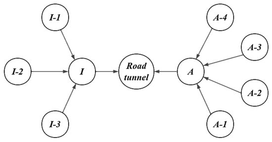 Figure 7. Functional network diagram of the road tunnel system, where I is the infrastructure system of the road tunnel, and A is the auxiliary function system of the road tunnel.