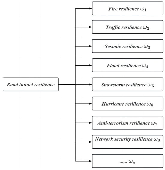 The types, severity, and frequency of external disturbances suffered by different road tunnels are quite different. So, the resilience evaluation of road tunnels should not only consider the common requirements but also focus on the differences in operating environments faced by different road tunnels. Therefore, the overall resilience value should be reflected using the resilience value of the road tunnel in response to different external disturbances, as shown in Figure 8. Furthermore, the following formulas for calculating the road tunnel resilience considering different operating environments are proposed. The weight of external disturbances is determined using the type of external disturbance. It is used to describe the difference in the operating environment faced by road tunnels so that the resilience evaluation is more suitable to the actual situation.