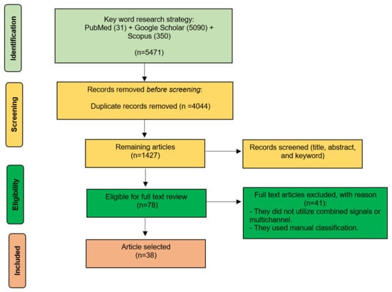 This systematic review focuses on machine learning investigations involving multiple channels of physiological signals, including EEG, ECG, EMG, EOG, and respiratory data for sleep stage classifications. The physiological signals were employed, as either a multichannel or a combination of multiple signals, to develop a model for the classification of sleep stages. We selected research studies that encompassed multiple physiological signals from reviews [30,32,33]. Furthermore, we conducted a thorough literature search to identify additional publications aligned with our criteria. Our emphasis on signal combinations sets this review apart and offers a valuable resource for researchers exploring this specialised domain.