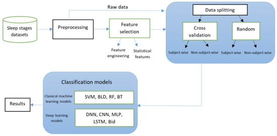 Figure 2 shows the conceptual framework for sleep stage classification. Researchers in this area use various datasets, such as Sleep-edf [35], Sleep-edfx [36], MASS [37], MIT-BIH [38], ISRUC-Sleep [39], SHHS [40], UCD [41], and PhysioNet Challenge [42]. In the preprocessing step, datasets are cleaned to exclude missing values and eliminate noise, artefacts, and other distortions. The most common preprocessing methods are filtering [43], normalization [44], and signal conditioning [45]. After that, the feature selection step is used to select the most important features that have a significant impact on the model’s performance. The two common methods for feature selection are feature engineering and statistical methods. Most of the existing work on sleep stage classification employs feature engineering methods, such as fast Fourier transform (FFT) [46], wavelet transform (WT) [47], short-time Fourier transform (STFT) [48], Pan–Tompkins algorithm [49], and temporal decomposition (TD) [50]. Common statistical methods include dynamic wrapping, dispersion entropy, max, mean, skew, and variance features [51]. However, recently, some studies proposed to use raw data as input without feature engineering or statistical methods to reduce the complexity of the proposed model. This approach allows deep learning algorithms to learn directly from raw data [52].