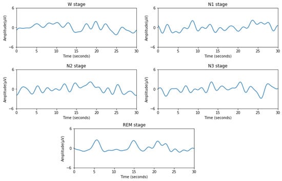 EEG techniques capture the brain’s electrical activity. Electrical signals in the brain can be measured by observing changes in the electrical activity between two electrodes over time. The standard method for measuring EEG signals is commonly known as the 10–20 system, which employs a minimum of 21 electrodes [54]. The EEG signal displays the diverse properties of brain activity. These activities help to classify sleep stages. Stage W is characterised by alpha activity in the occipital area [55]. The N1 stage is the transition between the W and N2 stages, and theta activity is one of the characteristics of EEG activity of the N1 stage [55]. Stage N2 is characterised by distinctive features known as spindles and K-complexes. Spindles are brief bursts of high-frequency brain activities, while K-complexes are characterised by sharp, high-amplitude brain activity with a unique appearance in EEG signals [56]. Delta activity is indicative of N3, which is a deep sleep stage [57]. The REM stage is characterised by rapid, low-voltage theta waves [58]. The distinct frequency ranges of EEG signals corresponding to each sleep stage are shown in Table 1. Figure 3 shows a sample of time series EEG data for the five sleep stages.