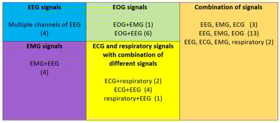 We have categorised studies into two further subcategorises below based on the type of signal combination used as input. The first category includes studies that utilise a combination of four types of signals as input: EEG, EMG, ECG, and respiratory. The second category encompasses studies that employ a combination of three types of signals as input: EEG, EMG, and ECG, or a combination of EEG, EMG, and EOG.