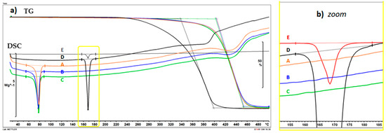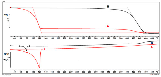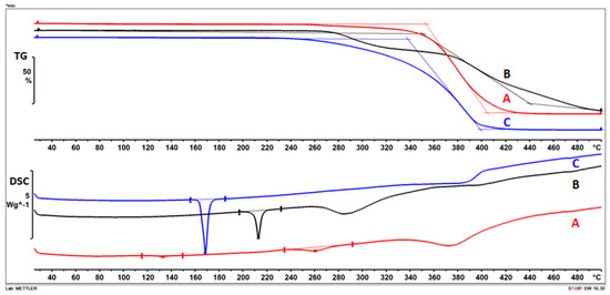 Differential scanning calorimetry (DSC) and thermogravimetric analysis (TG) measurements were performed with a Mettler-Toledo DSC 821e instrument (Mettler-Toledo GmbH, Greifensee, Switzerland), at the same time and under the same conditions. The samples were heated steadily from 25 °C to 500 °C in a non-hermetically sealed aluminum pan at a heating rate 10 °C/min. The mass of the samples was approximately 10 mg, and measurements were performed in a nitrogen atmosphere at a flow rate of 70 mL/min. Both TG and DSC signals obtained as a result of the measurement were recorded as a function of temperature, and when both are presented, they are represented on one graph as a thermogravimetric curve and a DSC curve.