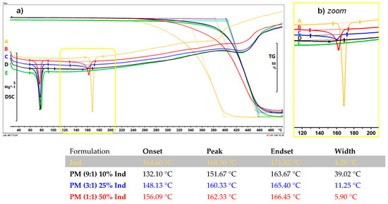 (a) DSC and TG curves and (b) the zoom of: (A) the bulk Ind, (B) the physical mixture (PM) of Compritol and Ind (1:1), (C) the physical mixture (PM) of Compritol and Ind (3:1), (D) the physical mixture (PM) of Compritol and Ind (9:1), (E) the bulk lipid Compritol. The parameters of the DSC curves characterizing the Ind peak are also listed below the graph.