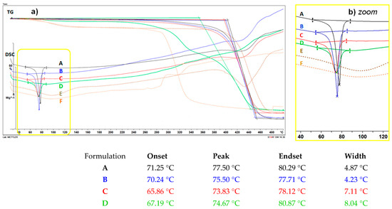 (a) DSC and TG curves and (b) the zoom of: (A) F10-SLM dispersion with Compritol and 0.2% of Ind, (B) F10-SLM after spray drying, (C) F10-SLM after spray drying with PVP, (D) F10-SLM after spray drying with Mx, (E) the bulk PVP and (F) the bulk Mx. The parameters of the DSC curves characterizing the lipid peak are also listed below the graph.