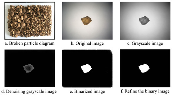 The size distribution of the shell fragments is closely related to the crushing characteristics and mechanism []. To determine the size distribution of the shell fragments, and considering the shell fragments with complex morphology, the projected area (PA) was obtained using the image processing function embedded in MATLAB R2018b software. The image processing process of the shell fragments is presented in Figure 3. Note that the threshold value, which is used to distinguish the boundaries of the shell fragments, plays an important role in determining shell fragment PA. Research indicates that, when compared to alternative methods like k-means clustering and the watershed algorithm, the adaptive thresholding technique is extensively utilized in boundary extraction due to its heightened robustness and adaptability [,]. Thus, the adaptive threshold was used to determine shell fragments’ PAs.