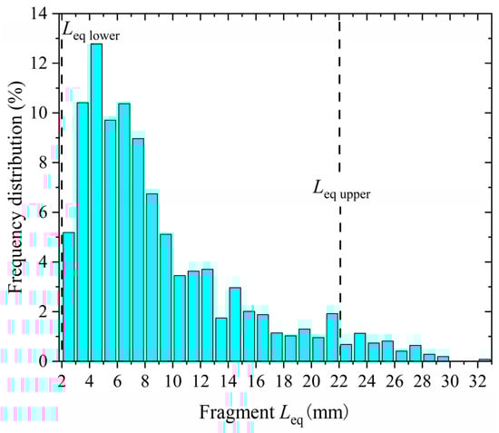 For statistical generality and accuracy, Leqs > 22 mm were excluded in this study. This is due to the small percentage and poor continuity of distribution in this range, as shown in Figure 4. It should be noted that a similar method was used in Refs. [,]. Based on this, the lg(Leqmax/Leq) vs. lgN curve of the shell fragments is shown in Figure 5. As shown, the curve has a good correlation with the fitted straight line (R2 = 0.95), which indicates that the Leq distribution of fragments follows the fractal distribution very well. From the fitted straight line, the Db also can be obtained: Db = 1.61. In addition, the fitting curve slightly deviates from the initial data points, which is likely due to the decrease in the number of large fragments.