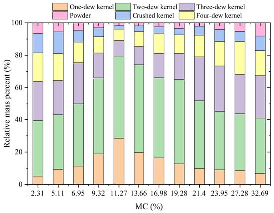 Figure 6 shows the relative mass percentages of various crushed kernels at different MCs. It clearly shows that the relative mass percentages of various crushed kernels have significant differences with the increase in the MC. In this case, the variation in crushed kernel rates with MC for individual grades is unlikely to be a full reflection of the relationship between the MC and the overall fragmentation degree. Therefore, to quantitatively characterize the overall fragmentation degree of kernels, as per Li et al., the average fragment size (dM) is used []. Note that the lower dM value means a larger degree of fragmentation. The formula of dM is shown as the following.