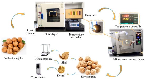 Drying is essential for walnut processing before shell breaking to quickly remove the moisture []. Among numerous drying technologies, HA-MVD has been widely used in the drying of foodstuffs due to its high efficiency and good processing quality [,,]. Therefore, in this study, HA-MVD was adopted to dry walnuts, with the aim to develop a drying approach that can be used to obtain the optimal crushing state on the basis of the premises of efficiency, quality and energy consumption.