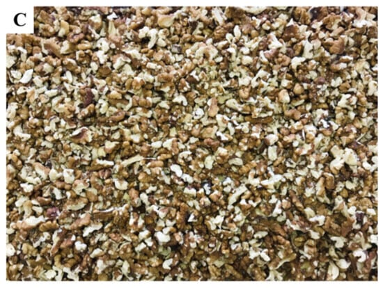 The crushing grade of kernels is important for the evaluation of the quality of walnuts for shell breaking. Crushed kernels were sieved into the six grades using standard sieves of 18, 12, 8, 4 and 2 mm based on a previous study: one-dew kernel, two-dew kernel, three-dew kernel, four-dew kernel, crushed kernel and powder [], as presented in Table 3.