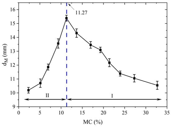In order to quantitatively analyze the effect of MC on the fragmentation degree of the kernels, Figure 11 shows the variation of dM with MC. As shown, the dM increased rapidly when the MC decreased from 32.69 to 11.27% (i.e., stage I). This is mainly due to the fact that, as MC decreases, the hardness and mechanical strength of the kernel increases due to its progressively tighter internal tissue structure [,]. At the same time, the shell, which is an important structure for moisture retention, creates a warm yet moist environment inside the walnut, thus improving the toughness of the kernels []. Hence, the dynamic interactions of self-hardening and external toughening endow kernels with mechanical strength and flexibility, thereby increasing the kernel’s resistance to fragmentation. In contrast, dM decreased rapidly when MC decreased from 11.27 to 2.31% (i.e., stage II). As MC continued to decrease, more cross-cracks were produced during multi-point extrusion due to the increased brittleness, resulting in a decrease in the size and an increase in the number of broken kernels []. Obviously, the change in dM with MC is consistent with the results of the qualitative analysis mentioned above. In addition, the results show that when MC was 11.27%, dM reached a maximum value of 15.39, corresponding to the smaller fragmentation degree of the shell, which conforms to the objective of walnut shell breaking. Therefore, an MC of 11.27% is treated as the CMC of kernels in this work.