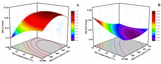 Generally, an efficient drying process uses a minimum amount of energy to dry the products to the desired MC. As summarized in Table 4, DQ ranges from 2.54 to 6.71 kW·h/kg. Figure 12B and Figure 13B display the response surface of each variable to DQ. As shown in Figure 12B, there is an interaction between the HA temperature and the microwave power. The change in DQ with another parameter is not significant at high levels of microwave power or HA temperature. However, DQ decreases rapidly with increasing HA temperature at low levels of microwave power. Increasing the HA temperature will shorten drying times and reduce the DQ. Similarly, the DQ decreases rapidly with increasing microwave power at low levels of HA temperature. The reason is that the increase in the microwave power leads to an increase in the intensity of radiation that the per-unit mass of walnuts receives, and with the increase in the drying rate, the corresponding drying time is significantly shortened, so the DQ decreases [].